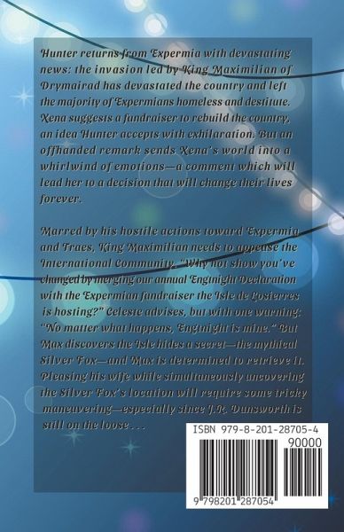 Hunter returns from Expermia with devastating news: the invasion led by King Maximilian of Drymairad has devastated the country and left the majority of Expermians homeless and destitute. Xena suggests a fundraiser to rebuild the country, an idea Hunter accepts with exhilaration. But an offhanded remark sends Xena's world into a whirlwind of emotions-a comment which will lead her to a decision that will change their lives forever. Marred by his hostile actions toward Expermia and Traes, King Maximilian needs to appease the International Community. "Why not show you've changed by merging our annual Engtnight Declaration with the Expermian fundraiser the Isle de Losierres is hosting?" Celeste advises, but with one warning: "No matter what happens, Engtnight is mine." But Max discovers the Isle hides a secret-the mythical Silver Fox-and Max is determined to retrieve it. Pleasing his wife while simultaneously uncovering the Silver Fox's location will require some tricky maneuvering-especially since J.R. Dunsworth is still on the loose . . .
