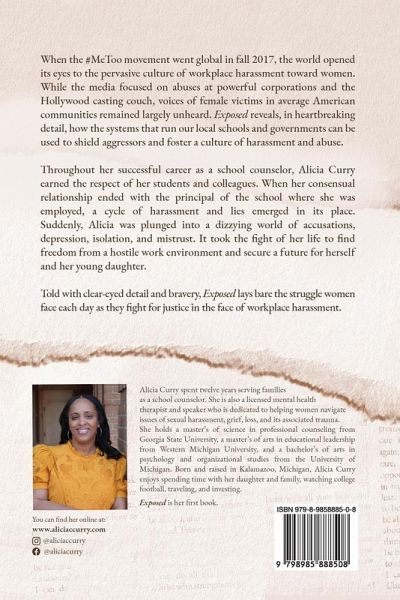 When the #MeToo movement went global in fall 2017, the world opened its eyes to the pervasive culture of workplace harassment toward women. While the media focused on abuses at powerful corporations and the Hollywood casting couch, voices of female victims in average American communities remained largely unheard. Exposed reveals, in heartbreaking detail, how the systems that run our local schools and governments can be used to shield aggressors and foster a culture of harassment and abuse. Throughout her successful career as a school counselor, Alicia Curry earned the respect of her students and colleagues. When her consensual relationship ended with the principal of the school where she was employed, a cycle of harassment and lies emerged in its place. Suddenly, Alicia was plunged into a dizzying world of accusations, depression, isolation, and mistrust. It took the fight of her life to find freedom from a hostile work environment and secure a future for herself and her young daughter. Told with clear-eyed detail and bravery, Exposed lays bare the struggle women face each day as they fight for justice in the face of workplace harassment.
