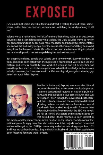 Someone is killing reporters and journalist Valerie Pierce fears she is next. When no one will believe her, not even the police, Valerie sets out to catch the killer herself. But her plan involves teaming up with her arch nemesis - TV actor Adam Jaymes. The darkly comical murder mystery novel Exposed. "If you enjoy dark humor mixed with gripping suspense, this book is a must-read. Ilett's writing is bold, engaging, and thoroughly entertaining, making Exposed an irresistible page-turner." ¿¿¿¿¿ Georgia Smith, Book Blogger at reads.georgia "Sensitive readers who do not enjoy murder and mayhem should not pick up this book" ¿¿¿¿¿ Kaivalya Khisti, The Online Bookclub US "Exposed positions former-journalist Paul Ilett as one of the most exciting contemporary writers of the past few years." ¿¿¿¿¿ The Table Read Magazine Valerie Pierce is reinventing herself. After more than thirty years as an outspoken columnist for a scandalous right-wing tabloid, the Daily Ear, she wants to renew her personal brand and be seen as a more moderate and thoughtful commentator. She knows she hurt many people over the course of her career, and likely destroyed many lives. But her own private life suffered too, and she is attempting to rebuild her relationships with her estranged daughter and ex-husband. Only people are dying. People Valerie used to work with. Every three days, at 9pm, someone connected with the Daily Ear is found dead. Valerie can see the pattern, and senses a serial killer is at work. But when no one will believe her, not even the police, she turns to the one person who has the knowledge and resources to help. However, it is someone with a lifetime of grudges against Valerie: gay television actor Adam Jaymes. Exposed is the sequel to Paul Ilett's 2014 surprise hit Exposé, a darkly comical thriller that became a bestseller across multiple genres including thrillers and gay fiction.