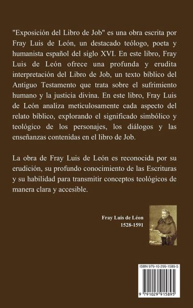 "Exposición del Libro de Job" es una obra escrita por Fray Luis de León, un destacado teólogo, poeta y humanista español del siglo XVI. En este libro, Fray Luis de León ofrece una profunda y erudita interpretación del Libro de Job, un texto bíblico del Antiguo Testamento que trata sobre el sufrimiento humano y la justicia divina. En este libro, Fray Luis de León analiza meticulosamente cada aspecto del relato bíblico, explorando el significado simbólico y teológico de los personajes, los diálogos y las enseñanzas contenidas en el libro de Job. La obra de Fray Luis de León es reconocida por su erudición, su profundo conocimiento de las Escrituras y su habilidad para transmitir conceptos teológicos de manera clara y accesible.