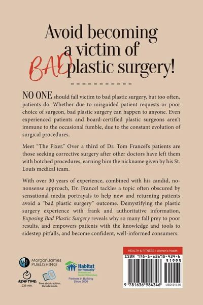 This enlightening guide by esteemed plastic surgeon Dr. Francel demystifies the plastic surgery experience and the common mistakes people make that lead to botched results.Dr. Francel makes the case that patient requests and poor selection of practitioners often play significant roles in adverse outcomes. He candidly reveals that even board-certified surgeons aren't immune to occasional unfavorable results, due to the constant evolution of surgical procedures.Exposing Bad Plastic Surgery presents honest, frank, and authoritative information to aid consumers in making decisions about plastic surgery. Dr. Francel exposes the realities behind the surge of poor plastic surgery results, and offers strategies to avoid falling victim to such circumstances. His expertise combined with his candid, no-nonsense approach to a topic often obscured by sensational media portrayals should help readers avoid a "bad plastic surgery" result.