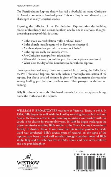 The Pretribulation Rapture theory has had a foothold on many Christians in America for over a hundred years. This teaching is not allowed to be challenged in many Christian circles. Exposing the Fallacies of the Pretribulation Rapture takes the building blocks of this theory and dismantles them one by one in a serious, thought-provoking analogy of this doctrine. • Is the seven year tribulation really a biblical term? • Is the church literally raptured in Revelation chapter 4? • Are there signs that precede the return of Christ? • Is the rapture really an invisible event? • Are Christians exempt from tribulation? • Where did the true roots of the pretribulation rapture come from? • What does the day of the Lord have to do with the rapture? These questions and many more are answered in Exposing the Fallacies of the Pre-Tribulation Rapture. Not only is there a thorough examination of the rapture, but also a detailed account is given of the numerous discrepancies among leading pretribulation teachers over Bible passages on the second coming. Billy Broadwater’s in-depth Bible based research for over twenty-years brings home the truth about the rapture.