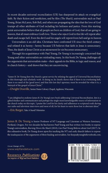 In recent decades universal reconciliation (UR) has sharpened its attack on evangelical faith. By their fiction and nonfiction, and by film (The Shack), universalists such as Paul Young, Brian McLaren, Rob Bell, and others are propagating the idea that the love of God trumps all other attributes of God including his holiness and justice. From this starting point universalists believe that all people are born as children of God, that all are going to heaven, that all must embrace God's love. Those who reject God in this life will repent after death and escape hell. Even the devil and his angels will repent from hell and go to heaven. Universalism is an old idea. Christians have confronted UR since the third century and refuted it as heresy--heresy because UR believes that faith in Jesus is unnecessary. Thus, the death of Jesus Christ as an atonement for sin becomes unnecessary. Through his acquaintance with Paul Young, De Young is increasingly concerned that Young and other universalists are misleading many. In this book De Young challenges all the arguments that universalists make--their appeals to the Bible, to logic and reason, and to church history--and shows that they are unconvincing.