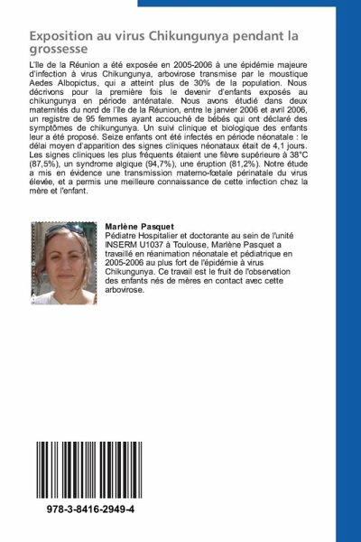 L île de la Réunion a été exposée en 2005-2006 à une épidémie majeure d infection à virus Chikungunya, arbovirose transmise par le moustique Aedes Albopictus, qui a atteint plus de 30% de la population. Nous décrivons pour la première fois le devenir d enfants exposés au chikungunya en période anténatale. Nous avons étudié dans deux maternités du nord de l île de la Réunion, entre le janvier 2006 et avril 2006, un registre de 95 femmes ayant accouché de bébés qui ont déclaré des symptômes de chikungunya. Un suivi clinique et biologique des enfants leur a été proposé. Seize enfants ont été infectés en période néonatale : le délai moyen d apparition des signes cliniques néonataux était de 4,1 jours. Les signes cliniques les plus fréquents étaient une fièvre supérieure à 38°C (87,5%), un syndrome algique (94,7%), une éruption (81,2%). Notre étude a mis en évidence une transmission materno-f tale périnatale du virus élevée, et a permis une meilleure connaissance de cette infection chez la mère et l'enfant.