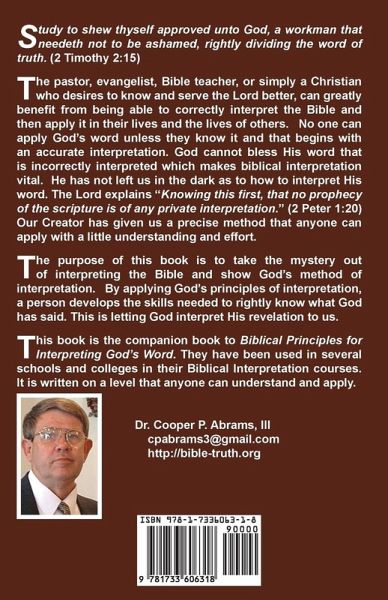 Many books have been written on the subject of how to study the Bible. This method's value is that it teaches the expository method of studying Scripture, which focuses on an exegetical investigation of the Bible and shows the individual how to study the Word of God for himself. In using this method of Bible study, you will be researching and gathering material about passages of Scripture. This method will help you to develop a systematic plan to follow in studying the Bible. It centers on completing a work sheet where the information is recorded. In completing the Work Sheet, you will be…mehr