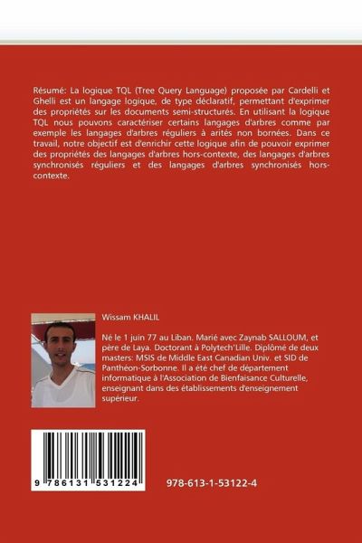 Résumé: La logique TQL (Tree Query Language) proposée par Cardelli et Ghelli est un langage logique, de type déclaratif, permettant d'exprimer des propriétés sur les documents semi-structurés. En utilisant la logique TQL nous pouvons caractériser certains langages d'arbres comme par exemple les langages d'arbres réguliers à arités non bornées. Dans ce travail, notre objectif est d'enrichir cette logique afin de pouvoir exprimer des propriétés des langages d'arbres hors-contexte, des langages d'arbres synchronisés réguliers et des langages d'arbres synchronisés hors-contexte.