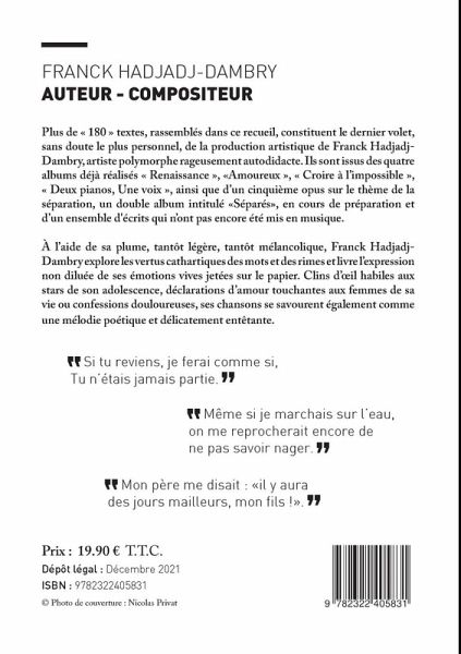 Les « 180 » textes rassemblés dans ce recueil constituent le dernier volet, sans doute le plus personnel, de la production artistique de Franck Hadjadj-Dambry, artiste polymorphe rageusement autodidacte. Ils sont issus des quatre albums déjà réalisés « Renaissance », «Amoureux », « Croire à l'impossible », « Deux pianos, Une voix », ainsi que d'un cinquième opus, un double album sur le thème de la séparation intitulé "Séparés", en cours de préparation et d'un ensemble d'écrits qui n'ont pas encore été mis en musique.À l'aide de sa plume, tantôt légère, tantôt mélancolique, Franck Hadjadj-Dambry explore les vertus cathartiques des mots et des rimes et livre l'expression non diluée de ses émotions vives jetées sur le papier. Clins d'oeil habiles aux stars de son adolescence, déclarations d'amour touchantes aux femmes de sa vie ou confessions douloureuses, ses chansons se savourent également comme une mélodie poétique et délicatement entêtante.