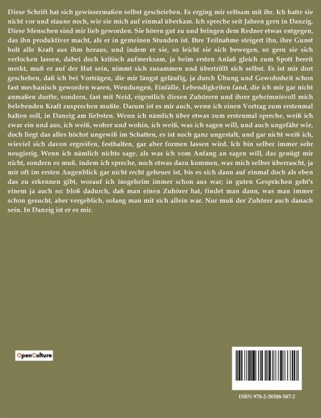 Diese Schrift hat sich gewissermaßen selbst geschrieben. Es erging mir seltsam mit ihr. Ich hatte sie nicht vor und staune noch, wie sie mich auf einmal überkam. Ich spreche seit Jahren gern in Danzig. Diese Menschen sind mir lieb geworden. Sie hören gut zu und bringen dem Redner etwas entgegen, das ihn produktiver macht, als er in gemeinen Stunden ist. Ihre Teilnahme steigert ihn, ihre Gunst holt alle Kraft aus ihm heraus, und indem er sie, so leicht sie sich bewegen, so gern sie sich verlocken lassen, dabei doch kritisch aufmerksam, ja beim ersten Anlaß gleich zum Spott bereit merkt, muß er auf der Hut sein, nimmt sich zusammen und übertrifft sich selbst. Es ist mir dort geschehen, daß ich bei Vorträgen, die mir längst geläufig, ja durch Übung und Gewohnheit schon fast mechanisch geworden waren, Wendungen, Einfälle, Lebendigkeiten fand, die ich mir gar nicht anmaßen durfte, sondern, fast mit Neid, eigentlich diesen Zuhörern und ihrer geheimnisvoll mich belebenden Kraft zusprechen mußte. Darum ist es mir auch, wenn ich einen Vortrag zum erstenmal halten soll, in Danzig am liebsten. Wenn ich nämlich über etwas zum erstenmal spreche, weiß ich zwar ein und aus, ich weiß, woher und wohin, ich weiß, was ich sagen will, und auch ungefähr wie, doch liegt das alles höchst ungewiß im Schatten, es ist noch ganz ungestalt, und gar nicht weiß ich, wieviel sich davon ergreifen, festhalten, gar aber formen lassen wird. Ich bin selber immer sehr neugierig. Wenn ich nämlich nichts sage, als was ich vom Anfang an sagen will, das genügt mir nicht, sondern es muß, indem ich spreche, noch etwas dazu kommen, was mich selber überrascht, ja mir oft im ersten Augenblick gar nicht recht geheuer ist, bis es sich dann auf einmal doch als eben das zu erkennen gibt, worauf ich insgeheim immer schon aus war; in guten Gesprächen geht's einem ja auch so: bloß dadurch, daß man einen Zuhörer hat, findet man dann, was man immer schon gesucht, aber vergeblich, solang man mit sich allein war. Nur muß der Zuhörer auch danach sein. In Danzig ist er es mir.