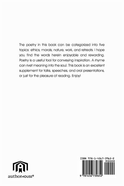 The poetry in this book can be categorized into five topics: ethics, morals, nature, work, and retreats. I hope you find the words herein enjoyable and rewarding. Poetry is a useful tool for conveying inspiration. A rhyme can rivet meaning into the soul. This book is an excellent supplement for talks, speeches, and oral presentations, or just for the pleasure of reading. Enjoy!