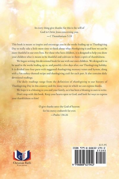 In every thing give thanks: for this is the will of God in Christ Jesus concerning you. --1 Thessalonians 5:18 This book is meant to inspire and encourage you in the weeks leading up to Thanksgiving Day to really take a little more time to think about what thanksgiving is and how we can be more thankful in our own lives. For those who have children, it is designed to help you show your children what it means to be thankful and cultivate in them a spirit of thankfulness. We began writing this devotional book for use with our own children. We designed it to be used in the weeks leading up to, and possibly a few days after, our Thanksgiving holiday. It is divided into four parts with suggested thanksgiving memory verses and hymns, along with a fun turkey-themed recipe and thanksgiving craft for each part. It also contains daily devotional readings. The daily readings range from the definition of thanksgiving to our history of Thanksgiving Day in this country and the many ways in which we can express thanks. We hope it is a blessing to you and your family, as it has been a blessing to ours to write. Don't stop with this book. Keep your hearts open to God, and look for ways to express your thankfulness to him! O give thanks unto the God of heaven: for his mercy endureth for ever. --Psalm 136:26