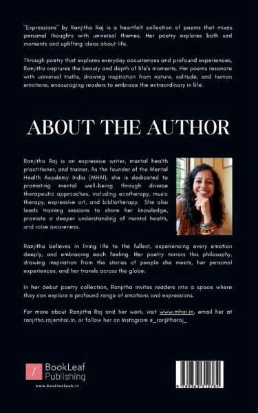 """"""Expressions"""" by Ranjitha Raj is a heartfelt collection of poems that mixes personal thoughts with universal themes. Her poetry explores both sad moments and uplifting ideas about life. Through poetry that explores everyday occurrences and profound experiences, Ranjitha captures the beauty and depth of life's moments. Her poems resonate with universal truths, drawing inspiration from nature, solitude, and human emotions, encouraging readers to embrace the extraordinary in life.""