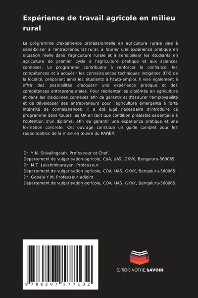 Le programme d'expérience professionnelle en agriculture rurale vise à sensibiliser à l'entrepreneuriat rural, à fournir une expérience pratique en situation réelle dans l'agriculture rurale et à sensibiliser les étudiants en agriculture de premier cycle à l'agriculture pratique et aux sciences connexes. Le programme contribuera à renforcer la confiance, les compétences et à acquérir les connaissances techniques indigènes (ITK) de la localité, préparant ainsi les étudiants à l'auto-emploi. Il vise également à offrir des possibilités d'acquérir une expérience pratique et des compétences entrepreneuriales. Pour réorienter les diplômés en agriculture et dans les disciplines connexes afin de garantir et d'assurer l'employabilité et de développer des entrepreneurs pour l'agriculture émergente à forte intensité de connaissances, il a été jugé nécessaire d'introduire ce programme dans toutes les UA en tant que condition préalable essentielle à l'obtention d'un diplôme, afin de garantir une expérience pratique et une formation concrète. Cet ouvrage constitue un guide complet pour les responsables de la mise en oeuvre du RAWEP.