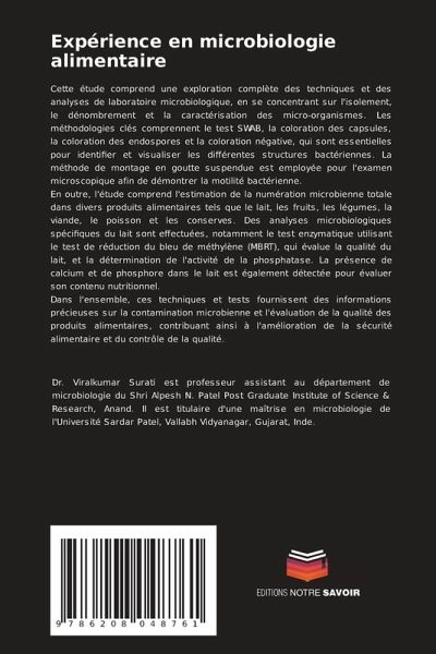 Cette étude comprend une exploration complète des techniques et des analyses de laboratoire microbiologique, en se concentrant sur l'isolement, le dénombrement et la caractérisation des micro-organismes. Les méthodologies clés comprennent le test SWAB, la coloration des capsules, la coloration des endospores et la coloration négative, qui sont essentielles pour identifier et visualiser les différentes structures bactériennes. La méthode de montage en goutte suspendue est employée pour l'examen microscopique afin de démontrer la motilité bactérienne.En outre, l'étude comprend l'estimation de la numération microbienne totale dans divers produits alimentaires tels que le lait, les fruits, les légumes, la viande, le poisson et les conserves. Des analyses microbiologiques spécifiques du lait sont effectuées, notamment le test enzymatique utilisant le test de réduction du bleu de méthylène (MBRT), qui évalue la qualité du lait, et la détermination de l'activité de la phosphatase. La présence de calcium et de phosphore dans le lait est également détectée pour évaluer son contenu nutritionnel.Dans l'ensemble, ces techniques et tests fournissent des informations précieuses sur la contamination microbienne et l'évaluation de la qualité des produits alimentaires, contribuant ainsi à l'amélioration de la sécurité alimentaire et du contrôle de la qualité.