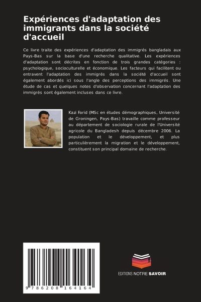 Ce livre traite des expériences d'adaptation des immigrés bangladais aux Pays-Bas sur la base d'une recherche qualitative. Les expériences d'adaptation sont décrites en fonction de trois grandes catégories : psychologique, socioculturelle et économique. Les facteurs qui facilitent ou entravent l'adaptation des immigrés dans la société d'accueil sont également abordés ici sous l'angle des perceptions des immigrés. Une étude de cas et quelques notes d'observation concernant l'adaptation des immigrés sont également incluses dans ce livre.