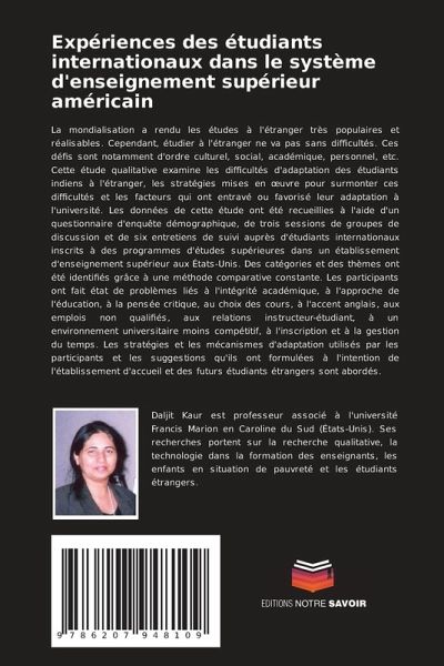 La mondialisation a rendu les études à l'étranger très populaires et réalisables. Cependant, étudier à l'étranger ne va pas sans difficultés. Ces défis sont notamment d'ordre culturel, social, académique, personnel, etc. Cette étude qualitative examine les difficultés d'adaptation des étudiants indiens à l'étranger, les stratégies mises en oeuvre pour surmonter ces difficultés et les facteurs qui ont entravé ou favorisé leur adaptation à l'université. Les données de cette étude ont été recueillies à l'aide d'un questionnaire d'enquête démographique, de trois sessions de groupes de discussion et de six entretiens de suivi auprès d'étudiants internationaux inscrits à des programmes d'études supérieures dans un établissement d'enseignement supérieur aux États-Unis. Des catégories et des thèmes ont été identifiés grâce à une méthode comparative constante. Les participants ont fait état de problèmes liés à l'intégrité académique, à l'approche de l'éducation, à la pensée critique, au choix des cours, à l'accent anglais, aux emplois non qualifiés, aux relations instructeur-étudiant, à un environnement universitaire moins compétitif, à l'inscription et à la gestion du temps. Les stratégies et les mécanismes d'adaptation utilisés par les participants et les suggestions qu'ils ont formulées à l'intention de l'établissement d'accueil et des futurs étudiants étrangers sont abordés.