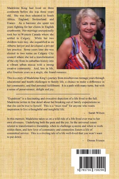 Madeleine King had lived on three continents before she was three years old. She was then educated in South Africa, England, Switzerland and France. As a barrister she spent ten years fighting for her clients in English courtrooms. Her marriage unexpectedly took her to Western Canada where she settled in Calgary. While her two children were tiny she requalified as an Alberta lawyer and developed a private law practice. Some years later she was elected to two terms on Calgary City council where she led a transformation of the city from its suburban history into a vibrant urban mecca with a strong creative community. And late in life, after fourteen years as a single, she found romance.