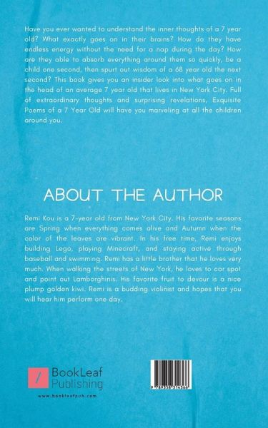 Have you ever wanted to understand the inner thoughts of a 7 year old? What exactly goes on in their brains? How do they have endless energy without the need for a nap during the day? How are they able to absorb everything around them so quickly, be a child one second, then spurt out wisdom of a 68 year old the next second? This book gives you an insider look into what goes on in the head of an average 7 year old that lives in New York City. Full of extraordinary thoughts and surprising revelations, Exquisite Poems of a 7 Year Old will have you marveling at all the children around you.