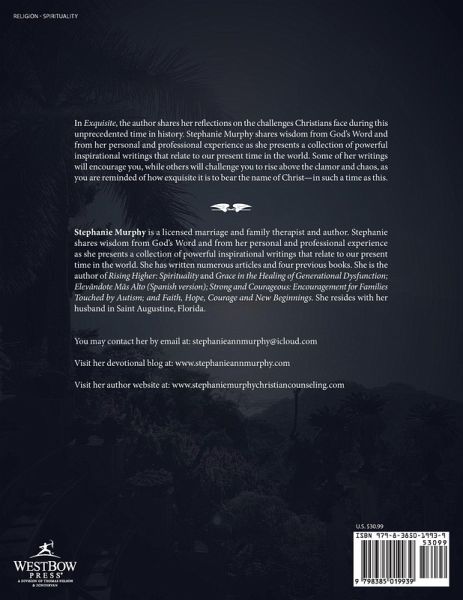 In Exquisite, the author shares her reflections on the challenges Christians face during this unprecedented time in history. Stephanie Murphy shares wisdom from God's Word and from her personal and professional experience as she presents a collection of powerful inspirational writings that relate to our present time in the world. Some of her writings will encourage you, while others will challenge you to rise above the clamor and chaos, as you are reminded of how exquisite it is to bear the name of Christ-in such a time as this.