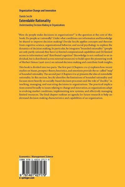 "How do people make decisions in organizations?" is the question at the core of this book. Do people act rationally? Under what conditions can information and knowledge be shared to improve decision making? Davide Secchi applies concepts and theories from cognitive science, organizational behavior, and social psychology to explore the dynamics of decision making. In particular, he integrates "bounded rationality" (people are only partly rational; they have (a) limited computational capabilities and (b) limited access to information) and "distributed cognition" (knowledge is not confined to an individual, but is distributed across the members of a group) to build upon the pioneering work of Herbert Simon (1916-2001) on rational decision making and contribute fresh insights.This book is divided into two parts. The first part (Chapters 2 to 5) explores how recent studies on biases, prospect theory, heuristics, and emotions provide the so-called "map" of bounded rationality. The second part (Chapter 6 to 8) presents the idea of extendable rationality. In this section, Secchi identifies the limitations of bounded rationality and focuses more heavily on socially-based decision processes and the role of "docility" in teaching, managing, and executing decisions in organizations. The practical implications extend broadly to issues relating to change and innovation, as organizations adapt to evolving market conditions, implementing new systems, and effectively managing limited resources. The final chapter outlines an agenda for future research to help understand the decision making characteristics and capabilities of an organization.