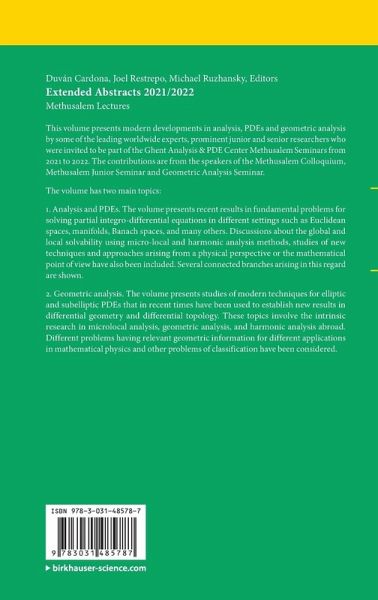 1. Analysis and PDEs. The volume presents recent results in fundamental problems for solving partial integro-differential equations in different settings such as Euclidean spaces, manifolds, Banach spaces, and many others. Discussions about the global and local solvability using micro-local and harmonic analysis methods, studies of new techniques and approaches arising from a physical perspective or the mathematical point of view have also been included. Several connected branches arising in this regard are shown. 2. Geometric analysis. The volume presents studies of modern techniques for elliptic and subelliptic PDEs that in recent times have been used to establish new results in differential geometry and differential topology. These topics involve the intrinsic research in microlocal analysis, geometric analysis, and harmonic analysis abroad. Different problems having relevant geometric information for different applications in mathematical physics and other problems of classification have been considered.