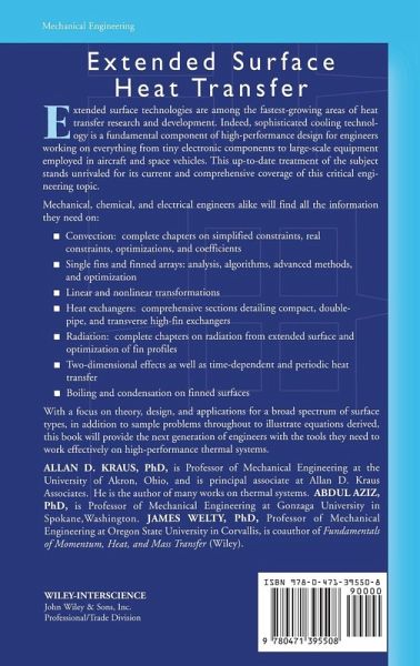 Allan D. Kraus, PhD, is Professor of Mechanical Engineering at the University of Akron, Ohio, and is principal associate at Allan D. Kraus Associates. He is the author of many works on thermal systems. Abdul Aziz, PhD, is Professor of Mechanical Engineering at Gonzaga University in Spokane, Washington. James Welty, PhD, Professor of Mechanical Engineering at Oregon State University in Corvallis, is co-author of Fundamentals of Momentum, Heat, and Mass Transfer (Wiley).