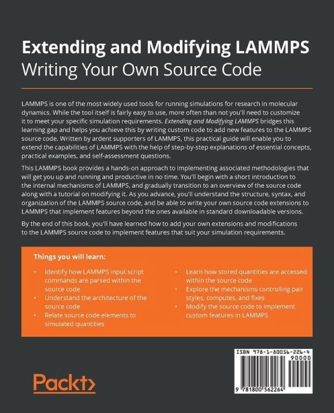 Understand the LAMMPS source code and modify it to meet your research needs, and run simulations for bespoke applications involving forces, thermostats, pair potentials and more with ease Key FeaturesUnderstand the structure of the LAMMPS source code Implement custom features in the LAMMPS source code to meet your research needs Run example simulations involving forces, thermostats, and pair potentials based on implemented features Book Description LAMMPS is one of the most widely used tools for running simulations for research in molecular dynamics. While the tool itself is fairly easy to use, more often than not you'll need to customize it to meet your specific simulation requirements. Extending and Modifying LAMMPS bridges this learning gap and helps you achieve this by writing custom code to add new features to LAMMPS source code. Written by ardent supporters of LAMMPS, this practical guide will enable you to extend the capabilities of LAMMPS with the help of step-by-step explanations of essential concepts, practical examples, and self-assessment questions. This LAMMPS book provides a hands-on approach to implementing associated methodologies that will get you up and running and productive in no time. You'll begin with a short introduction to the internal mechanisms of LAMMPS, and gradually transition to an overview of the source code along with a tutorial on modifying it. As you advance, you'll understand the structure, syntax, and organization of LAMMPS source code, and be able to write your own source code extensions to LAMMPS that implement features beyond the ones available in standard downloadable versions. By the end of this book, you'll have learned how to add your own extensions and modifications to the LAMMPS source code that can implement features that suit your simulation requirements. What You Will LearnIdentify how LAMMPS input script commands are parsed within the source code Understand the architecture of the source code Relate source code elements to simulated quantities Learn how stored quantities are accessed within the source code Explore the mechanisms controlling pair styles, computes, and fixes Modify the source code to implement custom features in LAMMPS Who this book is for ¿This book is for students, faculty members, and researchers who are currently using LAMMPS or considering switching to LAMMPS, have a basic knowledge of how to use LAMMPS, and are looking to extend LAMMPS source code for research purposes. This book is not a tutorial on using LAMMPS or writing LAMMPS scripts, and it is assumed that the reader is comfortable with the basic LAMMPS syntax. The book is geared toward users with little to no experience in source code editing. Familiarity with C++ programming is helpful but not necessary.