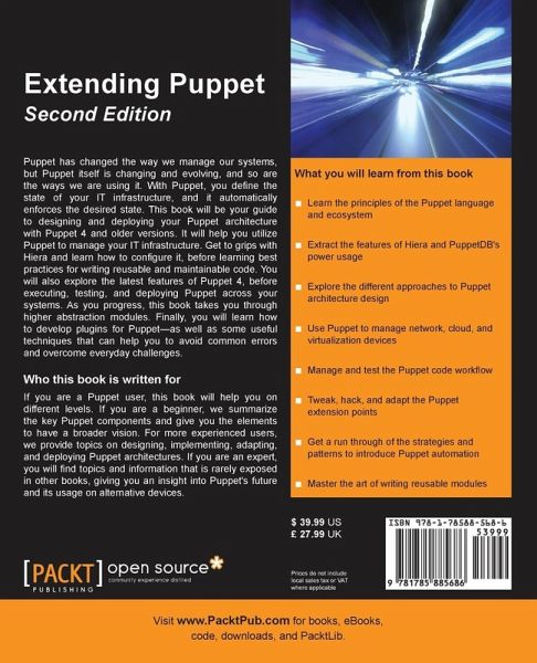 Start pulling the strings of your infrastructure with Puppet - learn how to configure, customize, and manage your systems more intelligently About This Book - Explore the wider Puppet ecosystem of useful tools - Design and manage your Puppet architecture for optimum performance - Write more efficient code that keeps your infrastructure more robust Who This Book Is For If you are a Puppet user, this book will help you on different levels. If you a beginner, we summarize the key Puppet components and give you the elements to have a broader vision. For more experienced users, you will be surprised by with topics on designing, implementing, adapting, and deploying Puppet architectures. If you are expert, you will find topics and information that is rarely exposed in other books, giving you an insight into Puppet's future and its usage on alternative devices. What You Will Learn - Learn the principles of Puppet language and ecosystem - Extract the features of Hiera and PuppetDB's power usage - Explore the different approaches to Puppet architecture design - Use Puppet to manage network, cloud, and virtualization devices - Manage and test the Puppet code workflow - Tweak, hack, and adapt the Puppet extension points - Get a run through of the strategies and patterns to introduce Puppet automation - Master the art of writing reusable modules In Detail Puppet has changed the way we manage our systems, but Puppet itself is changing and evolving, and so are the ways we are using it. To tackle our IT infrastructure challenges and avoid common errors when designing our architectures, an up-to-date, practical, and focused view of the current and future Puppet evolution is what we need. With Puppet, you define the state of your IT infrastructure, and it automatically enforces the desired state. This book will be your guide to designing and deploying your Puppet architecture. It will help you utilize Puppet to manage your IT infrastructure. Get to grips with Hiera and learn how to install and configure it, before learning best practices for writing reusable and maintainable code. You will also be able to explore the latest features of Puppet 4, before executing, testing, and deploying Puppet across your systems. As you progress, Extending Puppet takes you through higher abstraction modules, along with tips for effective code workflow management. Finally, you will learn how to develop plugins for Puppet - as well as some useful techniques that can help you to avoid common errors and overcome everyday challenges. Style and approach This is a collection of specific information about multiple topics related to Puppet and its ecosystem. Starting from a review of the very basics to more advanced topics, mixing practical advice with important theory and broader perspective, along with implementation details.