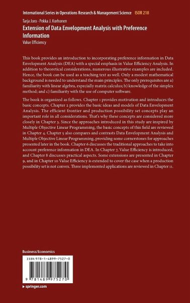 This book provides an introduction to incorporating preference information in Data Envelopment Analysis (DEA) with a special emphasis in Value Efficiency Analysis. In addition to theoretical considerations, numerous illustrative examples are included. Hence, the book can be used as a teaching text as well. Only a modest mathematical background is needed to understand the main principles. The only prerequisites are a) familiarity with linear algebra, especially matrix calculus; b) knowledge of the simplex method; and c) familiarity with the use of computer software.