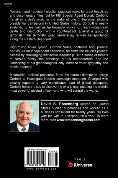 Terrorism and fraudulent election practices make for great headlines and documentary films, but for FBI Special Agent Donald Corbbitt, it's all in a day's work. In the wake of one of the most exciting presidential campaigns in United States history, Corbbitt is nearly stretched to his limit as he hurriedly works to thwart widespread death and destruction with a counterattack against a group of terrorists. The terrorists' goal: terminating railway transportation along the Eastern Seaboard. High-rolling liquor tycoon, Gordon Noble, confronts both political parties. As an independent candidate, he shifts the nation's political climate by challenging ineffective leadership. But a series of threats to Noble's family, the sabotage of his headquarters, and the kidnapping of his granddaughter only increase voter sympathy and media attention. Meanwhile, political pressures force the bureau director to assign Corbbitt to investigate Noble's campaign operation. Charged with piecing together a very complicated plan of global deception, Corbbitt holds the key to discovering who is manipulating the world's most powerful elected office-and who will control the world.