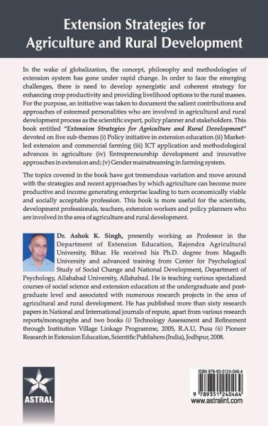 In the wake of globalization, the concept, philosophy and methodologies of extension system has gone under rapid change. In order to face the emerging challenges, there is need to develop synergistic and coherent strategy for enhancing crop productivity and providing livelihood options to the rural masses. For the purpose, an initiative was taken to document the salient contributions and approaches of esteemed personalities who are involved in agricultural and rural development process as the scientific expert, policy planner and stakeholders. This book entitled "Extension Strategies for Agriculture and Rural Development" devoted on five sub-themes (i) Policy initiative in extension education (ii) Market-led extension and commercial farming (iii) ICT application and methodological advances in agriculture (iv) Entrepreneurship development and innovative approaches in extension and; (v) Gender mainstreaming in farming system. The topics covered in the book have got tremendous variation and move around with the strategies and recent approaches by which agriculture can become more productive and income generating enterprise leading to turn economically viable and socially acceptable profession. This book is more useful for the scientists, development professionals, teachers, extension workers and policy planners who are involved in the area of agriculture and rural development.