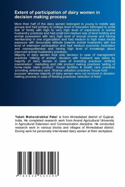 More than half of the dairy women belonged to young to middle age groupa and had primary to college level of education belonged to small size of family with high to very high level of experience in animal husbandry practices and had small tom medium size of land holding and animal possession with very high level of annual income and having membership in one organization and had medium to high mass media exposure with favourable attitude towards animal husbandry with low level of extension participation and had medium economic motivation and cosmopoliteness and having high level of knowledge about improved animal husbandry practices.Majority of dairy women took sole decision in case of management practices 'milking of animal', decision with husband was taken by majority of dairy women in case of breeding practices 'artificial insemination', marketing and milk product making practices 'selling of home-made claim product', house facilities & health care practices 'providing veterinary care', finance utilization practices 'house holdpurpose' whereas majority of dairy women were not involved in decision making process in case of feeding practices 'selection of feed'.