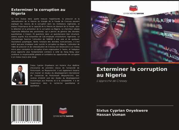 Ce livre évalue dans quelle mesure l'opportunité, la pression et la rationalisation de la théorie du triangle de la fraude de Cressey peuvent expliquer les raisons de la corruption dans les institutions nigérianes, et évalue l'importance de la capacité de la théorie du diamant de la fraude, pour la détection et la prévention de la corruption au Nigeria. Le chercheur adopte l'approche déductive des positivistes, qui a permis de générer des données quantitatives à travers 25 questions dans un questionnaire bien structuré, obtenu auprès d'un échantillon de 118 employés d'institutions nigérianes. La méthodologie favorise l'utilisation de l'ANOVA à une voie et de quelques illustrations graphiques. Après l'analyse des données transversales, il s'est avéré que pour éradiquer avec succès la corruption au Nigeria, l'utilisation de l'idée de pression et de rationalisation de Cressey est nécessaire à un niveau micro pour combattre la corruption d'une organisation à l'autre, et l'adoption d'une approche plus fondamentale similaire à celle de Hong Kong, pour améliorer la responsabilité globale et combattre les opportunités de corruption à un niveau macro plus large.