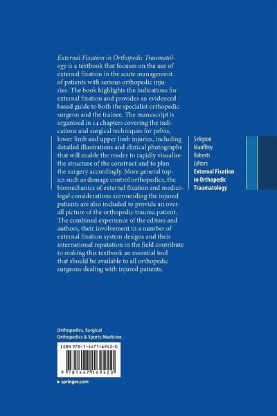 External fixation in Orthopedic traumatology is a textbook that focuses on the use of external fixation in the acute management of patients with serious orthopedic injuries. The book highlights the indications for external fixation and provides an evidenced based guide to both the specialist orthopedic surgeon and the trainee. The manuscript is organised in 15 chapters covering the indications and surgical techniques for pelvis, lower limb and upper limb injuries, including detailed illustrations and clinical photographs that will enable the reader to rapidly visualise the structure of the construct and to plan the surgery accordingly. More general topics such as damage control orthopedics, the biomechanics of external fixation and medico-legal considerations surrounding the injured patients are also included to provide an overall picture of the Orthopedic trauma patient. The Combined experience of the editors and authors, their involvement in a number of external fixation systemdesigns and their international reputation in the field contribute to making this textbook an essential tool that should be available to all orthopedic surgeons dealing with injured patients.