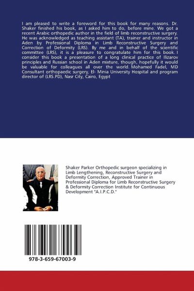 I am pleased to write a foreword for this book for many reasons. Dr. Shaker finished his book, as I asked him to do, before mine. We got a recent Arabic orthopedic author in the field of limb reconstructive surgery. He was acknowledged as teaching assistant (TA), trainer and instructor in Aden by Professional Diploma in Limb Reconstructive Surgery and Correction of Deformity (LRS). By me and in behalf of the scientific committee (LRS), it is a pleasure to congratulate him for this book. I consider this book a presentation of a long clinical practice of Ilizarov principles and Russian school in Aden mixture, though, hopefully it would be valuable for colleagues all over the world. Mohamed Fadel, MD Consultant orthopaedic surgery, El- Minia University Hospital and program director of (LRS.PD), Nasr City, Cairo, Egypt