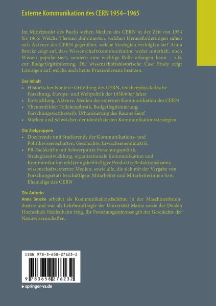 Im Mittelpunkt des Buchs stehen Medien des CERN in der Zeit von 1954 bis 1965: Welche Themen dominierten, welchen Herausforderungen sahen sich Akteure des CERN gegenüber, welche Strategien verfolgten sie? Anna Brocke zeigt auf, dass Wissenschaftskommunikation weder unterhält, noch Wissen popularisiert, sondern eine wichtige Rolle erlangen kann - z.B. zur Budgetlegitimierung. Die wissenschaftshistorische Case Study zeigt Lösungen auf, welche auch heute Praxisrelevanz besitzen.