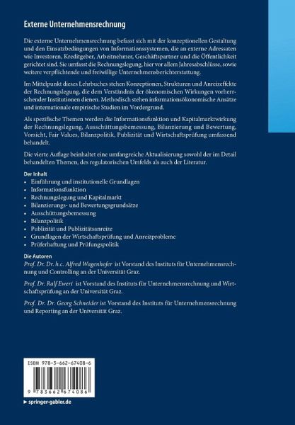 Als spezifische Themen werden die Informationsfunktion und Kapitalmarktwirkung der Rechnungslegung, Ausschüttungsbemessung, Bilanzierung und Bewertung, Vorsicht, Fair Values, Bilanzpolitik, Publizität und Wirtschaftsprüfung umfassend behandelt.