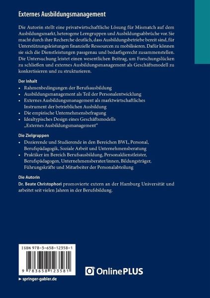 Die Autorin stellt eine privatwirtschaftliche Lösung für Mismatch auf dem Ausbildungsmarkt, heterogene Lerngruppen und Ausbildungsabbrüche vor. Sie macht durch ihre Recherche deutlich, dass Ausbildungsbetriebe bereit sind, für Unterstützungsleistungen finanzielle Ressourcen zu mobilisieren. Dafür können sie sich die Dienstleistungen passgenau und bedarfsgerecht zusammenstellen. Die Untersuchung leistet einen wesentlichen Beitrag, um Forschungslücken zu schließen und externes Ausbildungsmanagement als Geschäftsmodell zu konkretisieren und zu strukturieren.