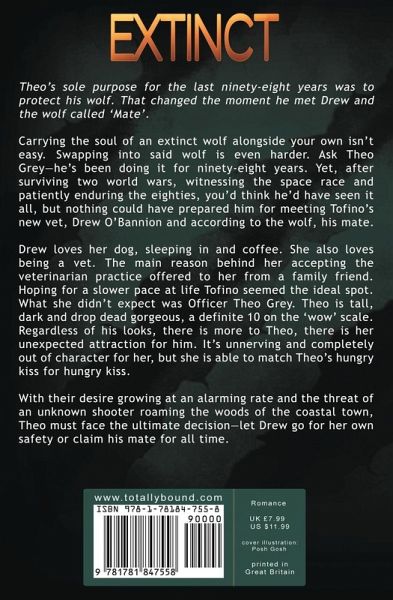 Theo's sole purpose for the last ninety-eight years was to protect his wolf. That changed the moment he met Drew and the wolf called 'Mate'. Carrying the soul of an extinct wolf alongside your own isn't easy. Swapping into said wolf is even harder. Ask Theo Grey-he's been doing it for ninety-eight years. Yet, after surviving two world wars, witnessing the space race and patiently enduring the eighties, you'd think he'd have seen it all, but nothing could have prepared him for meeting Tofino's new vet, Drew O'Bannion and according to the wolf, his mate. Drew loves her dog, sleeping in and coffee. She also loves being a vet. The main reason behind her accepting the veterinarian practice offered to her from a family friend. Hoping for a slower pace at life Tofino seemed the ideal spot. What she didn't expect was Officer Theo Grey. Theo is tall, dark and drop dead gorgeous, a definite 10 on the 'wow' scale. Regardless of his looks, there is more to Theo, there is her unexpected attraction for him. It's unnerving and completely out of character for her, but she is able to match Theo's hungry kiss, for hungry kiss. With their desire growing at an alarming rate and the threat of an unknown shooter roaming the woods of the coastal town, Theo must face the ultimate decision-let Drew go for her own safety or claim his mate for all time.