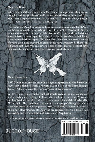 B.W. Gibson is an American novelist, singer/songwriter and world-traveler. Previously published works are parts one and two of his Extra Innings Trilogy: The Diamond Thieves and Race of the Gemini. A Hero Among Thieves is his third published novel and the final installment in this coming of age trilogy. Gibson, who was born in St. Louis, Missouri and has lived all over the United States, now resides with his husband in Akron, Ohio. He hopes these stories touch many peoples lives, particularly those who either lived during the late 1940s and early 50s, as well as, those whose parents, grandparents and great-grandparents grew up during this fascinating and climatic time in the American Deep South. For more information on this American author visit www.bwgibson.net