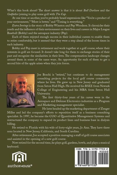 What's this book about? The short answer is that it is about Bull Durham and the Godfather joining to play some golf with Tin Cup. At one time or another, you've probably heard expressions like "You're a product of your environment," "More is better," and "Timing is everything." Extra Innings is the story of Bobby Winston and Pep Woodson. It chronicles their youth and the influence of their environment on their lives and careers in Major League Baseball (Bobby) and the aerospace industry (Pep). Each of them enjoyed enough success in their individual careers to enable them to retire comfortably, but it seemed that they were a step ahead of the boom times in each industry. Bobby and Pep meet in retirement and work together at a golf course, where their interests in golf are focused. It doesn't take long for them to exchange stories of their past and recognize the similarities in their lives. The compensation landscape changes around them in some of the same ways. An opportunity for each of them to get a second bite of the apple arises when they join forces.