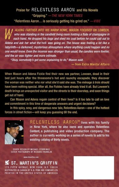 When Mason and Adena Fickle find their new sex partner, Loween, dead in their bed just hours after the threesome's hot and raunchy escapade, they discover the woman was neither who nor what she'd said she was. The ménage à trois should have been nothing special. After all, the Fickles have already tried it all. But Loween's death brings an unexpected visitor and the streets to their doorstep, and soon things get out of hand. Can Mason and Adena regain control of their lives? Is it too late to call on love and commitment in this time of desperate answers and urgent decisions? In this spicy, sexy, and dangerous new tale, Relentless Aaron---one of the hottest forces in street fiction---will keep you guessing till the end.