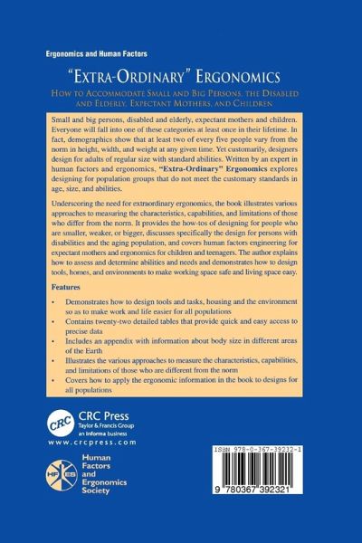Underscoring the need for extraordinary ergonomics, this book illustrates various approaches to measuring the characteristics, capabilities, and limitations of those who differ from the norm. An expert in human factors and ergonomics provides the how-tos of designing for people who are smaller, weaker, or bigger, discusses specifically the design for persons with disabilities and the aging population, and covers human factors engineering for expectant mothers and ergonomics for children and teenagers. He explains how to assess and determine abilities and needs and demonstrates how to design tools, homes, and environments to make working space safe and living space easy.