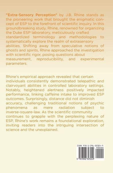 "Extra-Sensory Perception" by J.B. Rhine stands as the pioneering work that brought the enigmatic concept of ESP to the forefront of scientific inquiry. In this groundbreaking study, Rhine, renowned for organizing the Duke ESP laboratory, meticulously crafted standardized terminology and methodologies to systematically explore the realm of extrasensory abilities. Shifting away from speculative notions of ghosts and spirits, Rhine approached the investigation with scientific rigor, posing questions about measurement, reproducibility, and experimental parameters. Rhine's empirical approach revealed that certain individuals consistently demonstrated telepathic and clairvoyant abilities in controlled laboratory settings. Notably, heightened alertness positively impacted performance, linking caffeine intake to improved ESP outcomes. Surprisingly, distance did not diminish accuracy, challenging traditional notions of psychic phenomena as mere radiation subject to inverse-square-law. As the scientific community continues to grapple with the perplexing nature of ESP, Rhine's work remains a foundational exploration, inviting readers into the intriguing intersection of science and the unexplained.