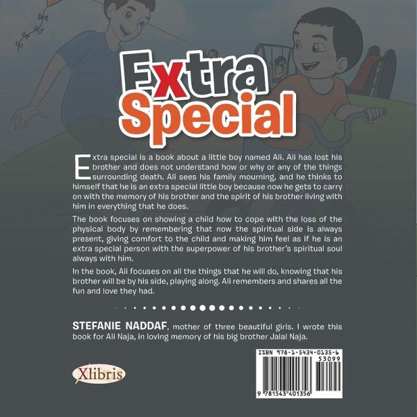 Extra special is a book about a little boy named Ali. Ali has lost his brother and does not understand how or why or any of the things surrounding death. Ali sees his family mourning, and he thinks to himself that he is an extra special little boy because now he gets to carry on with the memory of his brother and the spirit of his brother living with him in everything that he does. The book focuses on showing a child how to cope with the loss of the physical body by remembering that now the spiritual side is always present, giving comfort to the child and making him feel as if he is an extra special person with the superpower of his brother’s spiritual soul always with him. In the book, Ali focuses on all the things that he will do, knowing that his brother will be by his side, playing along. Ali remembers and shares all the fun and love they had.