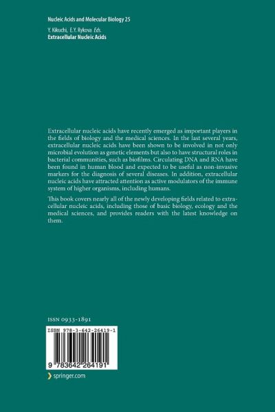 Extracellular nucleic acids have recently emerged as important players in the fields of biology and the medical sciences. In the last several years, extracellular nucleic acids have been shown to be involved in not only microbial evolution as genetic elements but also to have structural roles in bacterial communities, such as biofilms. Circulating DNA and RNA have been found in human blood and expected to be useful as non-invasive markers for the diagnosis of several diseases. In addition, extracellular nucleic acids have attracted attention as active modulators of the immune system of higher organisms, including humans.This book covers nearly all of the newly developing fields related to extracellular nucleic acids, including those of basic biology, ecology and the medical sciences, and provides readers with the latest knowledge on them.