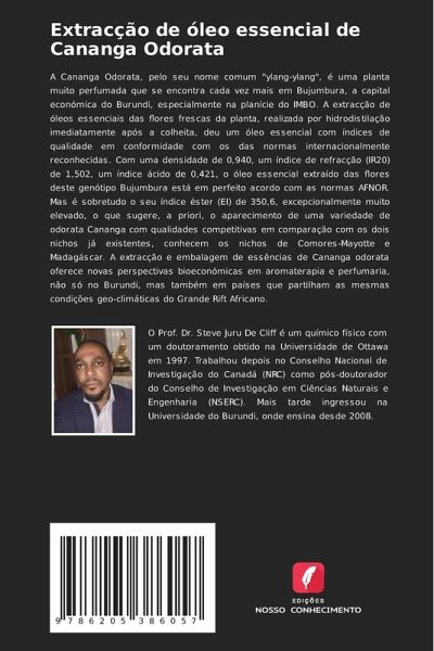 A Cananga Odorata, pelo seu nome comum "ylang-ylang", é uma planta muito perfumada que se encontra cada vez mais em Bujumbura, a capital económica do Burundi, especialmente na planície do IMBO. A extracção de óleos essenciais das flores frescas da planta, realizada por hidrodistilação imediatamente após a colheita, deu um óleo essencial com índices de qualidade em conformidade com os das normas internacionalmente reconhecidas. Com uma densidade de 0,940, um índice de refracção (IR20) de 1,502, um índice ácido de 0,421, o óleo essencial extraído das flores deste genótipo Bujumbura está em perfeito acordo com as normas AFNOR. Mas é sobretudo o seu índice éster (EI) de 350,6, excepcionalmente muito elevado, o que sugere, a priori, o aparecimento de uma variedade de odorata Cananga com qualidades competitivas em comparação com os dois nichos já existentes, conhecem os nichos de Comores-Mayotte e Madagáscar. A extracção e embalagem de essências de Cananga odorata oferece novas perspectivas bioeconómicas em aromaterapia e perfumaria, não só no Burundi, mas também em países que partilham as mesmas condições geo-climáticas do Grande Rift Africano.