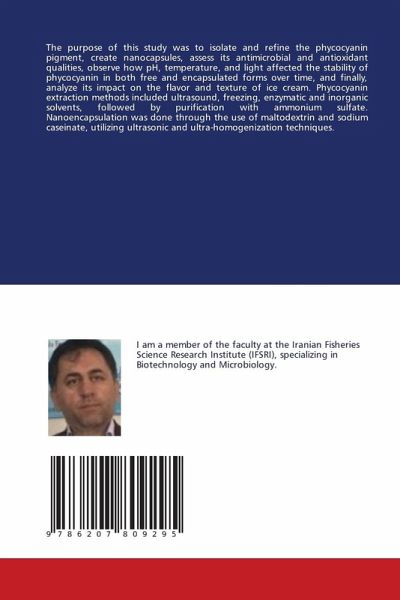 The purpose of this study was to isolate and refine the phycocyanin pigment, create nanocapsules, assess its antimicrobial and antioxidant qualities, observe how pH, temperature, and light affected the stability of phycocyanin in both free and encapsulated forms over time, and finally, analyze its impact on the flavor and texture of ice cream. Phycocyanin extraction methods included ultrasound, freezing, enzymatic and inorganic solvents, followed by purification with ammonium sulfate. Nanoencapsulation was done through the use of maltodextrin and sodium caseinate, utilizing ultrasonic and ultra-homogenization techniques.