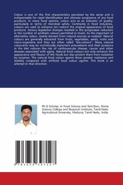 Colour is one of the first characteristics perceived by the sense and is indispensable for rapid identification and ultimate acceptance of any food products. In many food systems, colour acts as an indicator of quality, particularly in terms of microbial safety. Commonly in food industries, colours are used to enhance (or) restore the original appearance of food products. Serious legislative changes resulted in the progressive reduction in the number of synthetic colours permitted in foods. So the important of alternative colour, mainly derived from natural sources as realized. Natural colours are generally extracted from fruits, vegetables, seeds, roots and micro-organisms and they are often called "bio-colours". Many natural colourants may be nutritionally important antioxidants and their presence in the diet reduces the risk of cardiovascular disease, cancer and other diseases associated with aging. Natural food colours not only enhance the appearance and flavour of the foods but also protect them from oxidation by enzymes. The natural food colour agents show greater resistance and stability compared with artificial food colour agents. This book is an attempt in that direction.