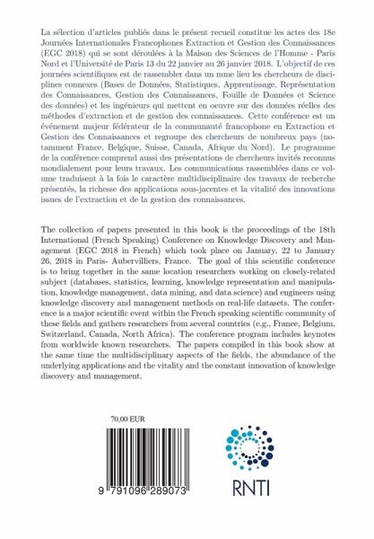 La sélection d'articles publiés dans le présent recueil constitue les actes des 18èmes Journées Internationales Francophones Extraction et Gestion des Connaissances (EGC 2018) qui se sont déroulées à la Maison des Sciences de l'Homme - Paris Nord et l'Université de Paris 13 du 22 janvier au 26 janvier 2018. L'objectif de ces journées scientifiques est de rassembler dans un même lieu les chercheurs de disciplines connexes (Bases de Données, Statistiques, Apprentissage, Représentation des Connaissances, Gestion des Connaissances, Fouille de Données et Science des données) et les ingénieurs qui mettent en oeuvre sur des données réelles des méthodes d'extraction et de gestion des connaissances. Cette conférence est un événement majeur fédérateur de la communauté francophone en Extraction et Gestion des Connaissances et regroupe des chercheurs de nombreux pays (notamment France, Belgique, Suisse, Canada, Afrique du Nord). Le programme de la conférence comprend aussi des présentations de chercheurs invités reconnus mondialement pour leurs travaux. Les communications rassemblées dans ce volume traduisent à la fois le caractère multidisciplinaire des travaux de recherche présentés, la richesse des applications sous-jacentes et la vitalité des innovations issues de l'extraction et de la gestion des connaissances.