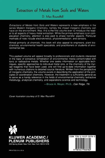 Extractions of Metals from Soils and Waters represents a new emphasis in the series Modern Inorganic Chemistry, namely the impact inorganic chemistry can have on the environment. Also, this is the first volume ever to introduce the reader to all aspects of heavy metal extraction. While the primary emphasis is on complexation chemistry, attention is also paid to phase transfer aspects. Particular methods of note include electrokinetics, phytoremediation, and sensors. Aimed primarily at chemists, this book will also appeal to engineers, plant biochemists, environmental health specialists, and practitioners or students of environmental law.